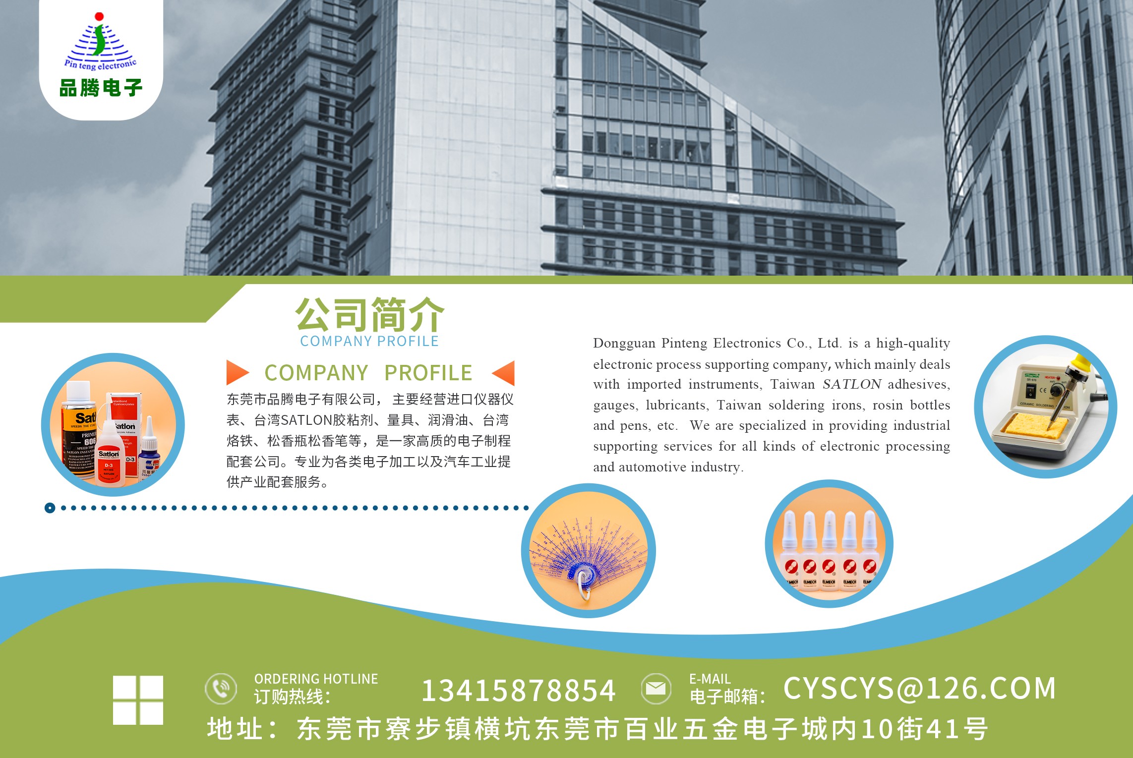 東莞市品騰電子有限公司, 主要經(jīng)營進口儀器儀表、臺灣Satlon膠粘劑、量具、潤滑油、臺灣烙鐵、松香瓶松香筆等,是一家高質(zhì)的電子制程配套公司。專業(yè)為各類電子加工業(yè)以及汽車工業(yè)提供產(chǎn)業(yè)配套服務(wù)。
